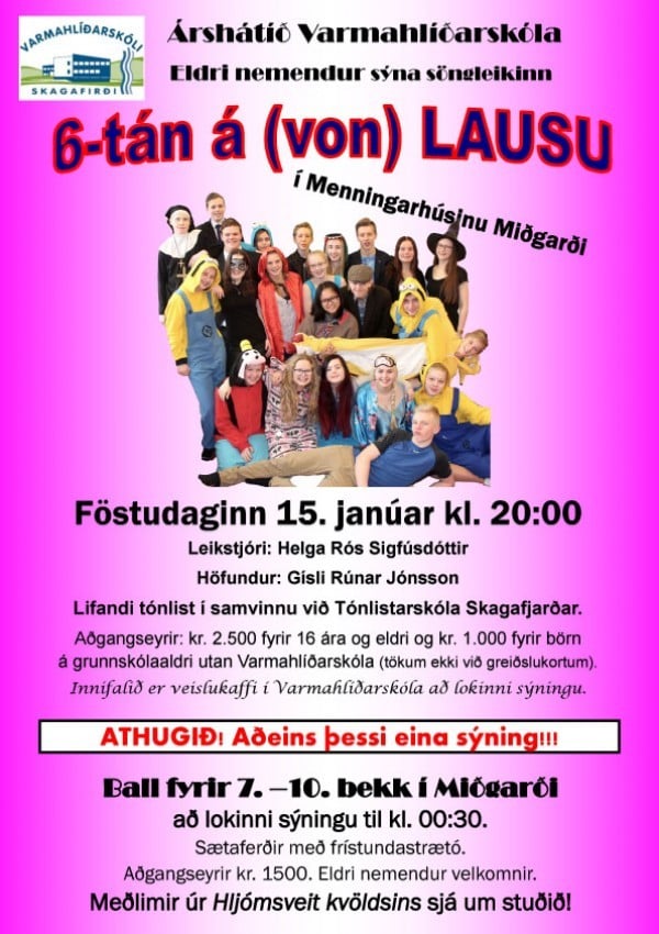 Árshátíð eldri nemenda í Varmahlíðarskóla verður föstudaginn 15. janúar í Miðgarði og hefst hún kl 20. Það er söngleikurinn 6-tán á (von) LAUSU í leikstjórn Helgu Rósar Sigfúsdóttur sem verður settur á svið en höfundur verksins er Gísli Rúnar Jónsson.