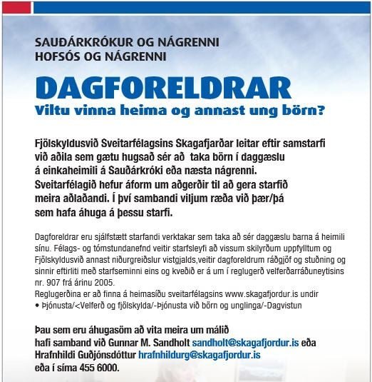Sveitarfélagið hefur áform um aðgerðir til að gera starf dagforeldra meira aðlaðandi og vilja ræða við þær/þá sem hafa áhuga á þessu starfi. Þau sem áhugasöm eru að vita meira um málið er bent á að hafa samband við Gunnar M. Sandholt, sandholt@skagafjordur.is eða Hrafnhildi Guðjónsdóttur, hrafnhildurg@skagafjordur.is eða í síma 455 6000.