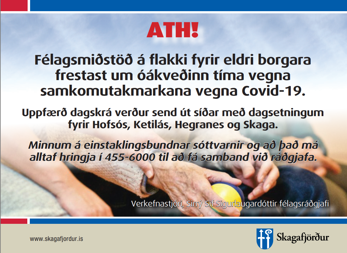 Félagsmiðstöð á flakki fyrir eldriborgara frestast um óákveðin tíma vegna samkomutakmarkana vegna Covid-19.