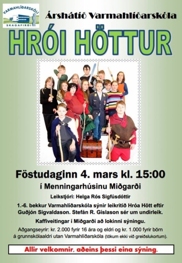 Árshátíð yngri nemenda í Varmahlíðarskóla verður haldin í Miðgarði, föstudaginn 4. mars kl. 15:00. Nemendur 1.- 6. bekkjar sýna leikritið um Hróa Hött eftir handriti Guðjóns Sigvaldasonar. Leikstjóri er Helga Rós Sigfúsdóttir og um undirleik sér Stefán R. Gíslason. Aðgangseyrir er 2000 kr fyrir 16 ára og eldri og 1000 kr fyrir nemendur á grunnskólaaldri utan Varmahlíðarskóla. Innifalið í aðgangseyrinum eru kaffiveitingar að lokinni sýningunni.