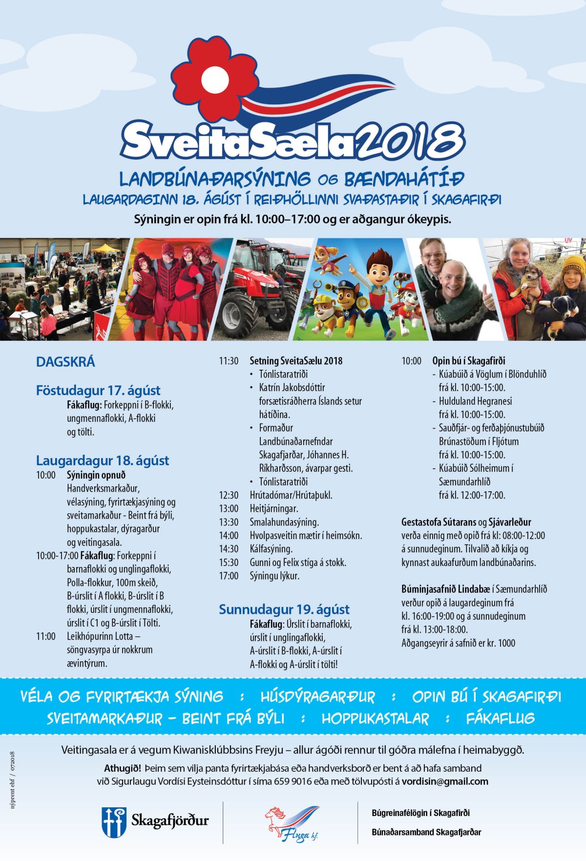Sveitasæla 2018, landbúnaðarsýning og bændahátíð, verður haldin laugardaginn 18.ágúst í reiðhöllinni Svaðastaðir í Skagafirði frá kl. 10:00 – 17:00.
