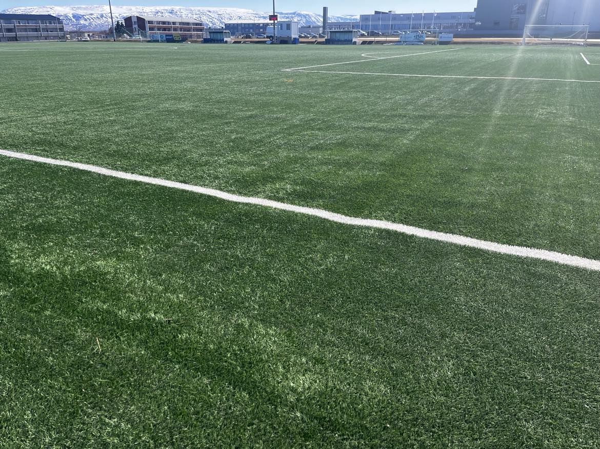 Við athugun í vikunni liggur fyrir að skemmdir urðu á vellinum á um 1.500 fermetrum, þar af eru um 1.000 fermetrar illa farnir. Helstu skemmdir eru á undirlagi vallarinns.