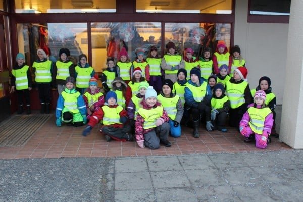 Nemendur í 1. - 4. bekk mátuðu vestin og stilltu sér upp fyrir myndavélina. Á heimasíðu skólans færa nemendur og starfsfólk Sigrúnu þakkir fyrir góða gjöf sem kemur að góðum notum, ekki síst á þessum tíma árs þegar skammdegið ríkir yfir stórum hluta skóladagsins.